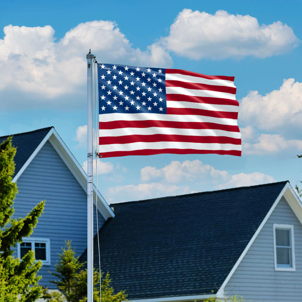Our True American Flag is 3ft x 5ft and double-stitched poly flag with brass grommets for durability. It's the perfect size for hanging in a window or proudly waving outside your home.