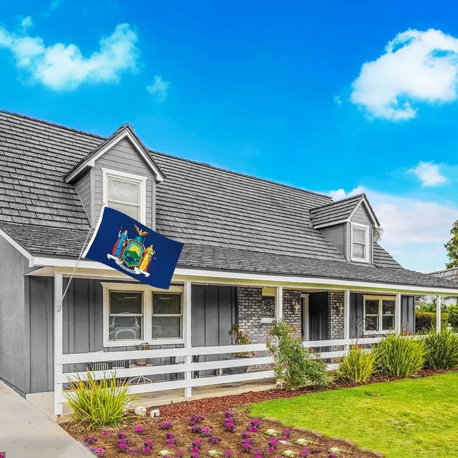 Our New York State Flag is 3ft x 5ft and double-stitched with brass grommets for durability. It's the perfect size for hanging in a window or proudly waving outside your home.