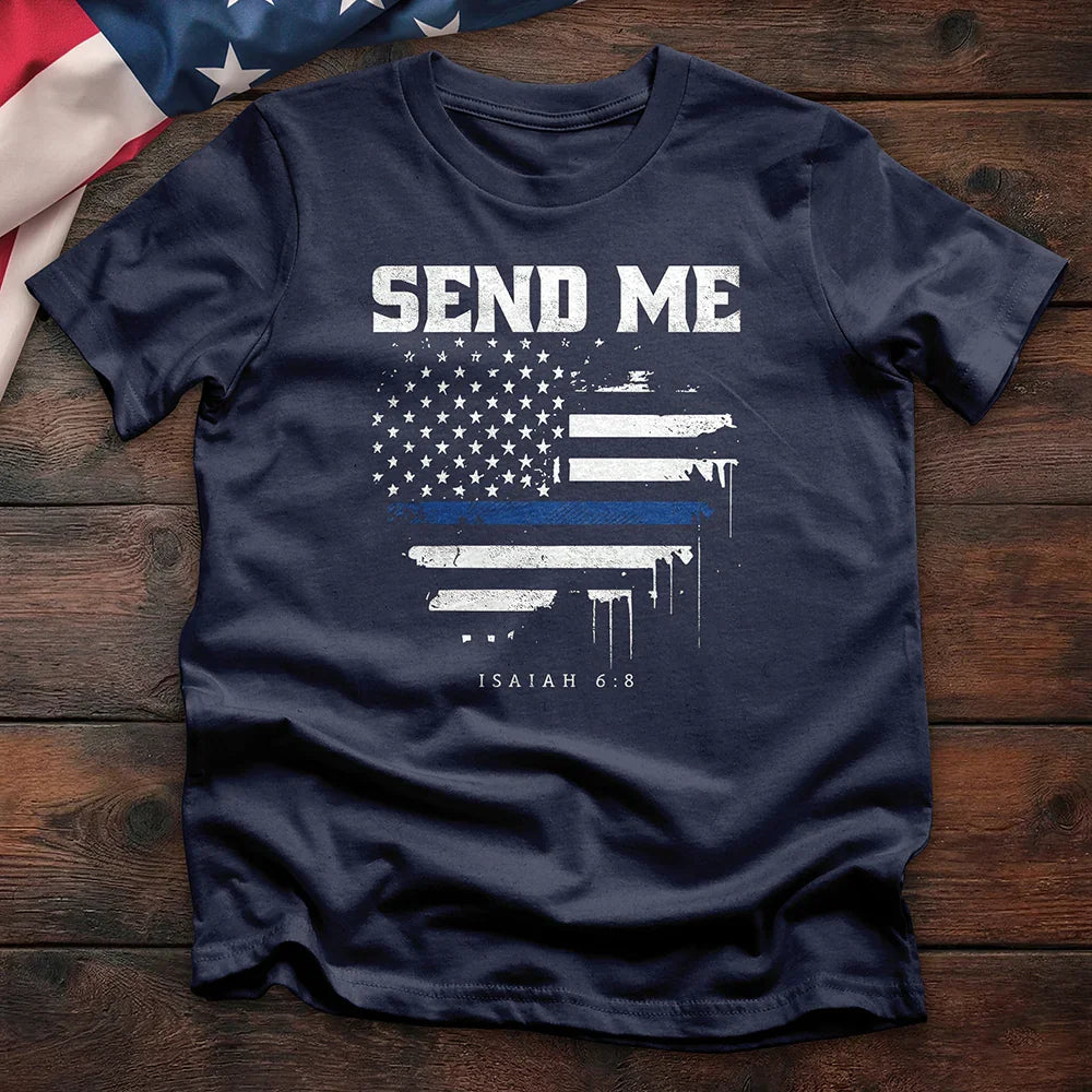 This edition of the Send Me Isaiah 6:8 Flag Tee is crafted exclusively for those who want to wear their faith and patriotism with pride. The unique combination of the flag and inspirational biblical verse keeps you both stylish and centered on your convictions. As trending faith-based fashion items fly off the shelves this season, this tee fits right in with the desire for clothing that expresses both belief and love for country.